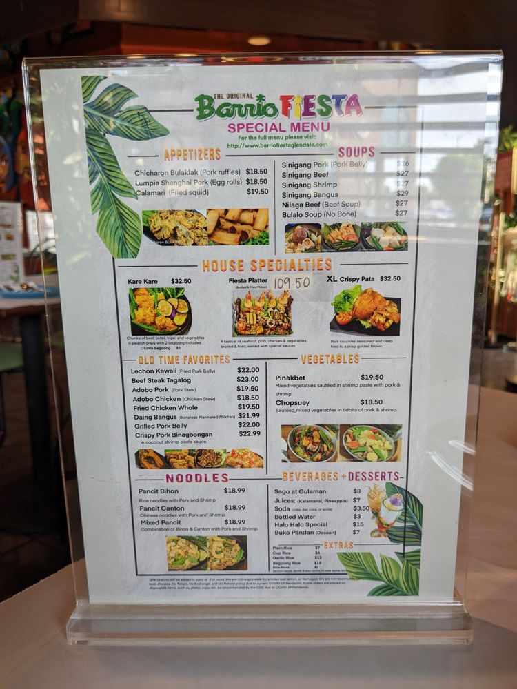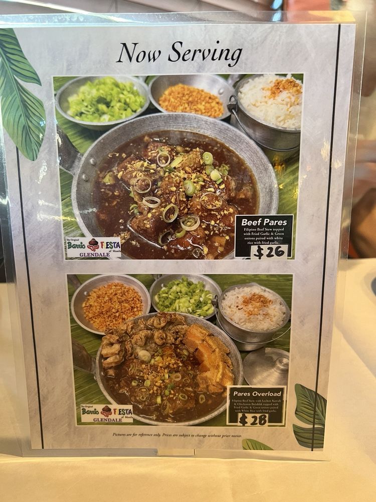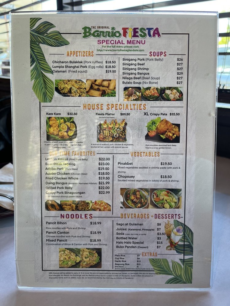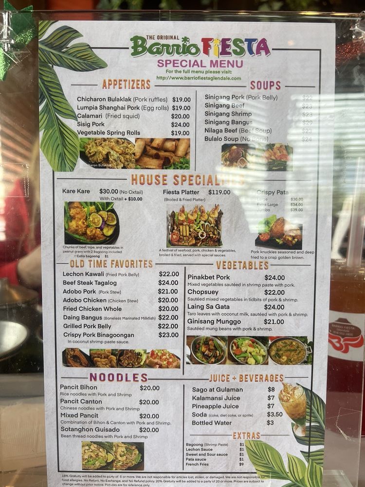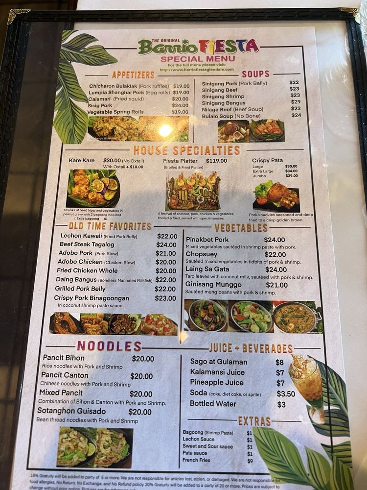 Barrio Fiesta Glendale offers a diverse menu of Filipino classics, including flavorful dishes like Pork Adobo, Chicken Adobo, and Beef Kaldereta. Customers rave about the crispy Pata and Sisig, which are must-tries. The ambiance is described as vibrant and welcoming, with friendly waitstaff like Ate Anna providing exceptional service. The restaurant's decorations reflect Filipino culture, adding to the overall dining experience. Although the space is cozy, it is well-kept and clean. Customers appreciate the attention to detail in the food presentation and the freshness of the dishes. Barrio Fiesta Glendale is a hidden gem, offering a taste of authentic Filipino cuisine in a warm and inviting setting.