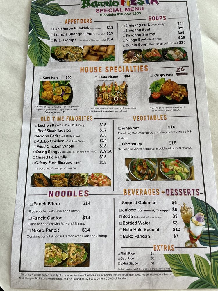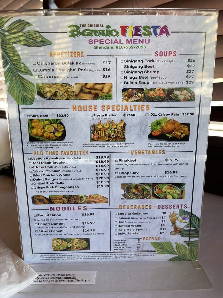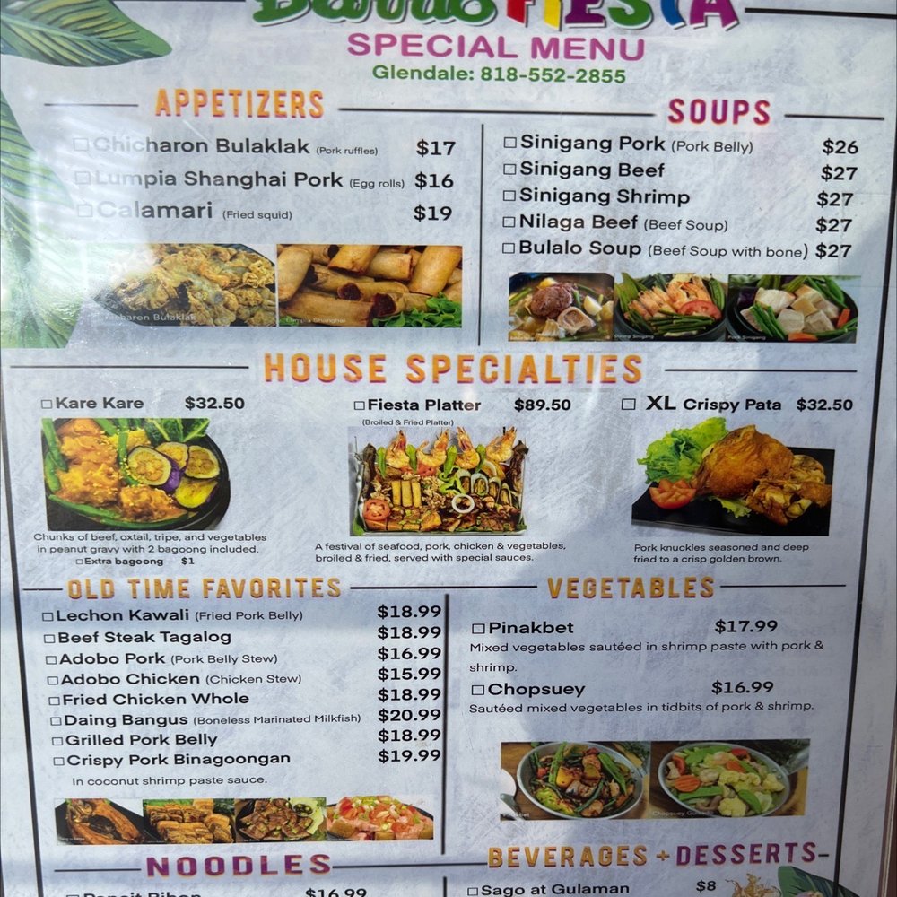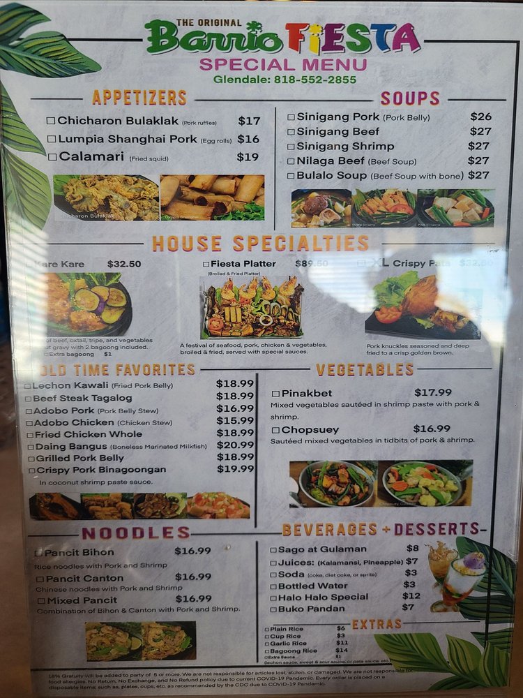 Barrio Fiesta Glendale offers a diverse menu of Filipino classics, including flavorful dishes like Pork Adobo, Chicken Adobo, and Beef Kaldereta. Customers rave about the crispy Pata and Sisig, which are must-tries. The ambiance is described as vibrant and welcoming, with friendly waitstaff like Ate Anna providing exceptional service. The restaurant's decorations reflect Filipino culture, adding to the overall dining experience. Although the space is cozy, it is well-kept and clean. Customers appreciate the attention to detail in the food presentation and the freshness of the dishes. Barrio Fiesta Glendale is a hidden gem, offering a taste of authentic Filipino cuisine in a warm and inviting setting.